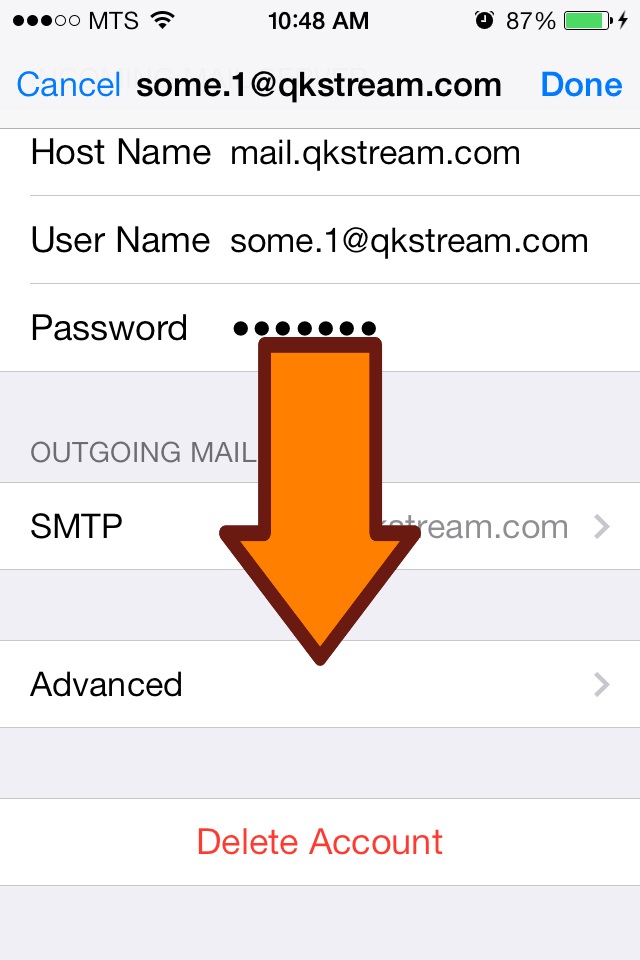 13. Now that the Outgoing Mail Server is set correctly we have to ensure the Incoming Mail Server is set properly. In the Account screen scroll to the bottom and tap on Advanced. Once the screen is up make sure your information matches the picture shown here.