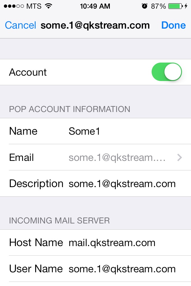 8. The Incoming Mail Server information is mail.qkstream.com the user name and password are your e-mail address and password. As shown.